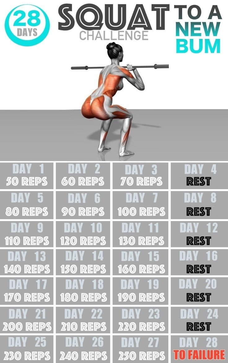 If you believe this 28-day squat challenge is too much for you, just do as many squats as you can every day of the challenge. Try to really push your limit on the last day of the challenge.