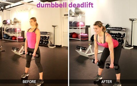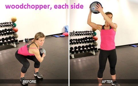 Grab a set of medium-weight dumbbells and stand with your feet shoulder-width on a workout mat. Perform the following exercises back to back, followed by 1 minute of rest before repeating the exercises. Make sure you perform the woodchopper on both sides before moving onto the dumbbell deadlift.