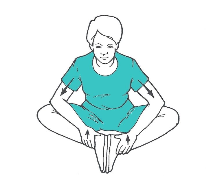 - Sit down on the floor or mat and bring the soles of your feet together.
