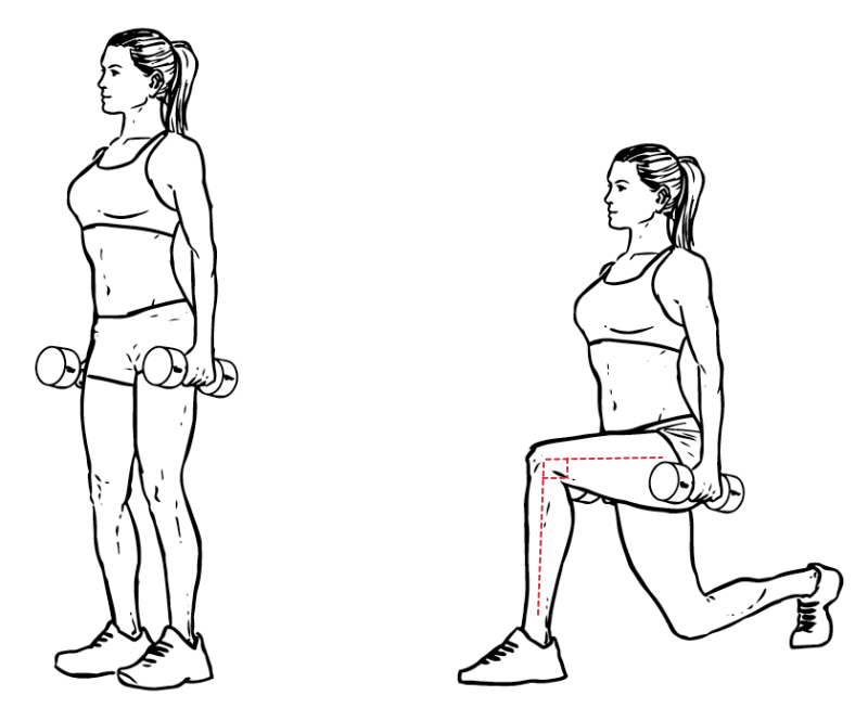 - Take a step forward with the left leg. Make sure the leg bends at the knee until it forms a 90-degree angle.