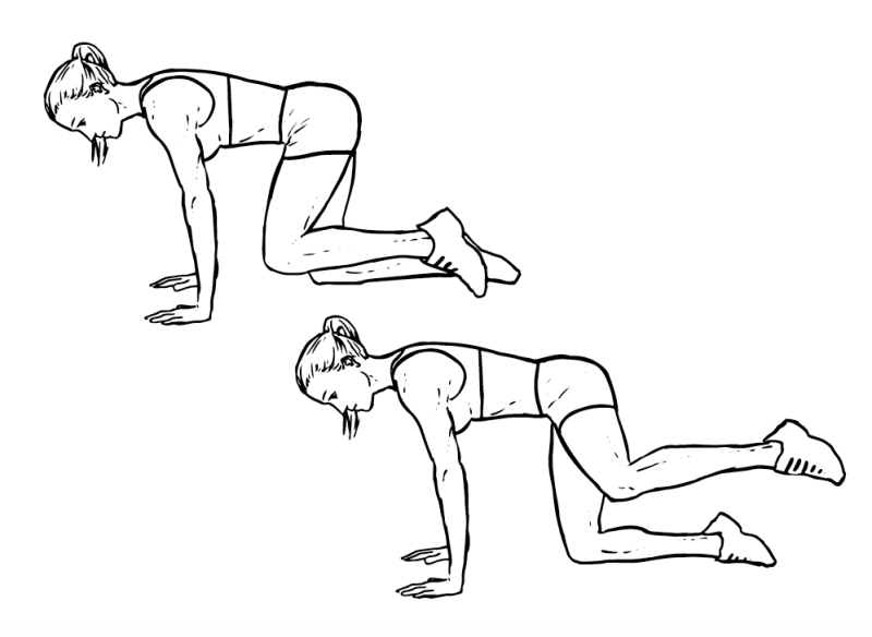 - Start on all fours, hands shoulder width and knees hip-width apart.