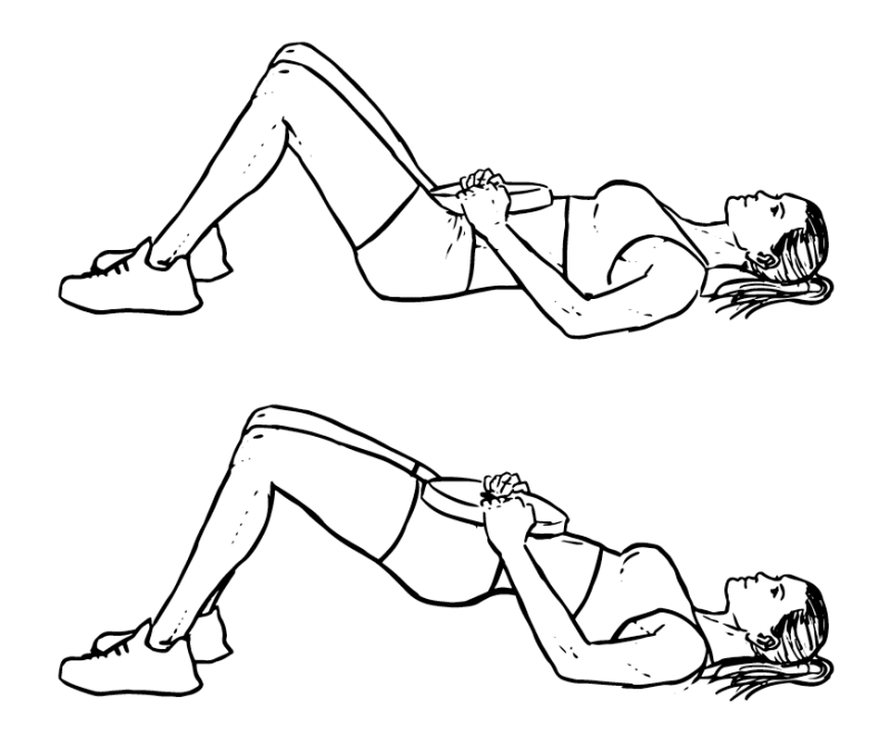 - Lay on your back and hold a plate (or a dumbbell) on your hips.