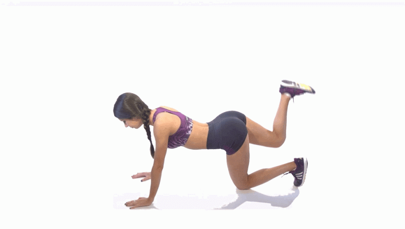 Keep hands and knees on the floor. Keep your right leg bent, while raising the foot to the ceiling. Keep your head straight and eyes forward. Repeat 15 times for each leg.