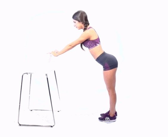 Stand straight with your hands on a chair with high back support. Keep a distance of one step between you and the chair.