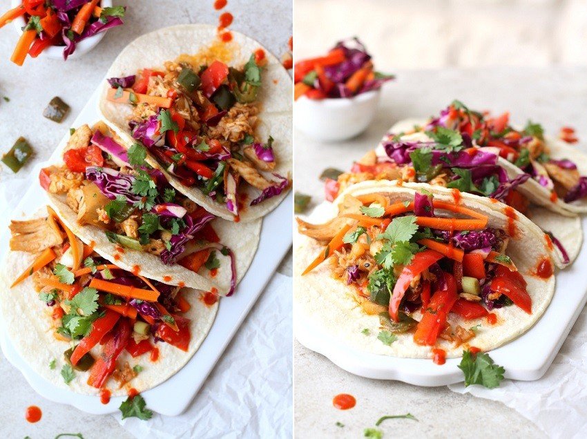 How to assemble the tacos: Fill tortilla shells with chicken and slaw. Top with sriracha, if desired. Serve.