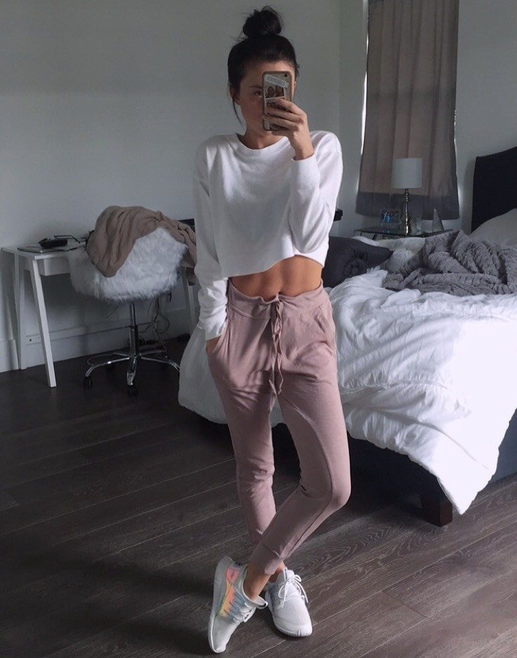 Pairing your crop of choice with high waist bottoms is a must to nail the trend. Choose black leggings, fitted neutral joggers, or a coordinating ensemble for a casual, yet stylish look.