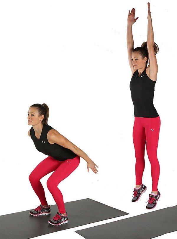 To perform these, stand with your feet shoulder-width apart, while holding your hands either behind your head or on the hips. Drop your hips down as you would in a normal squat, and when you return to the original position instead of rising slowly, jump up, and high in the air as you can. These movements are warm up exercises that not only work your legs, but also your abs, and which get even your lungs ready for an intense exercise.