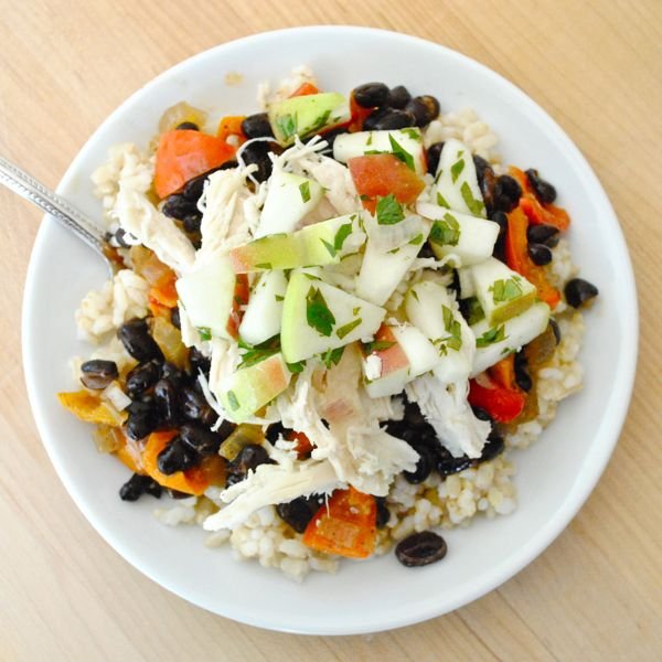 - Layer rice, beans, chicken, and apple salsa on plates and serve!