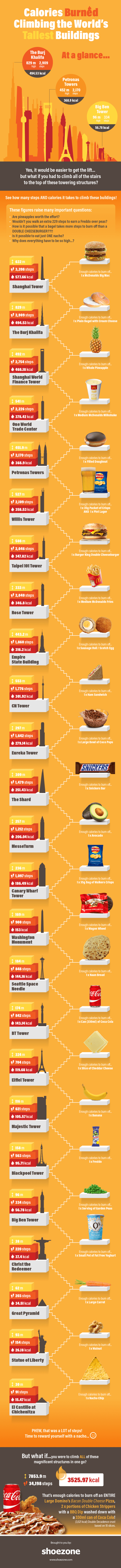 Shoe retailer Shoe Zone wanted to take a slightly different look at how exercise can help you burn calories. So they decided to find out how many calories you would burn if you climbed each of the world’s tallest buildings and landmarks.
