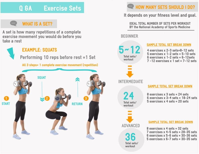 Sets refer to repeating the same exercise a certain number of rounds. Beginners should start with 2 sets and as you progress you can increase to 3-4 sets per exercise.