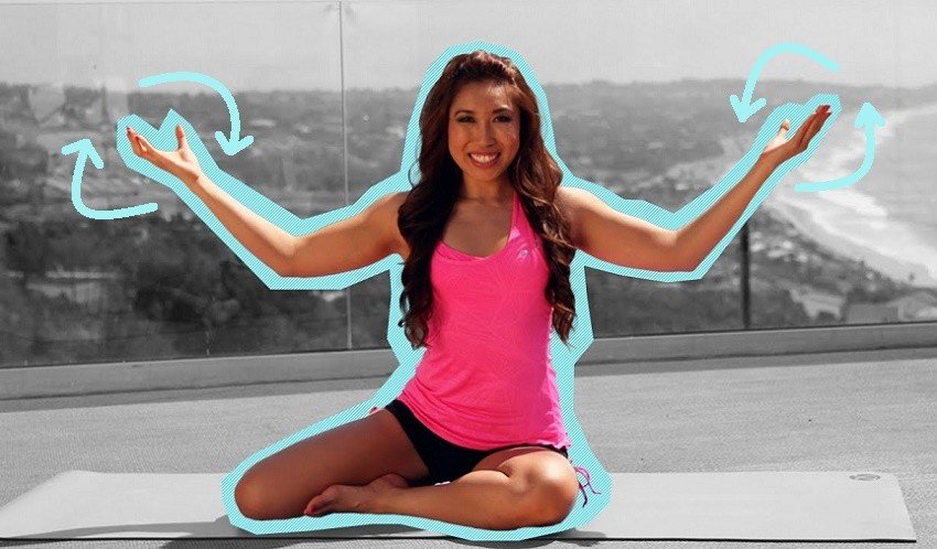 Sit down on your butt with your arms open asides, palms facing the ceiling and elbows slightly bent. Now move your arms fast in small circles. I want you to tense up those arms! After 40 seconds reverse the rotation for another 40 seconds.