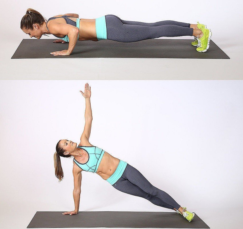 Start in the push up position and perform one. Then bring one hand right underneath your chest, twist your torso and rise up the other arm. Repeat for 50 seconds then rest before getting to the next exercise for sleek arms.