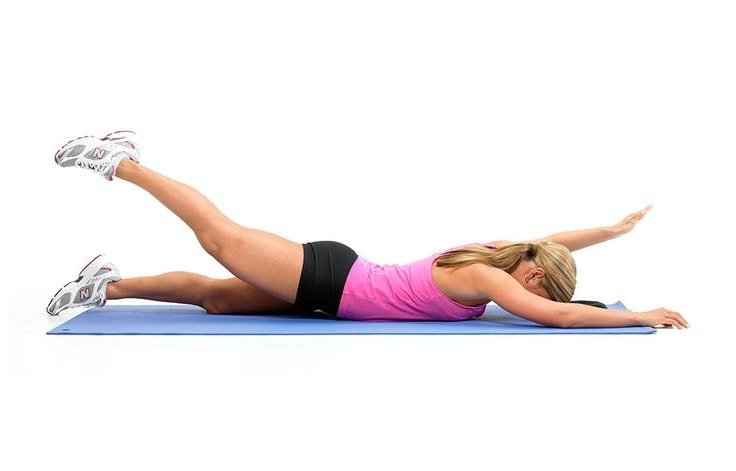 - Simultaneously, lift your right leg and left arm as much as possible.