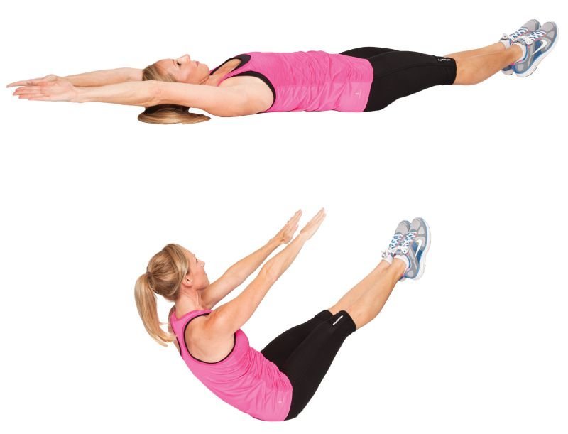 Lay down on your back and lift your legs and shoulders off the ground. Keep your legs and arms straight. Crunch up and then lay back down without touching the floor with your legs. Do it for 30 seconds.