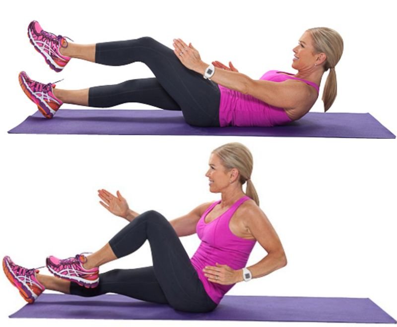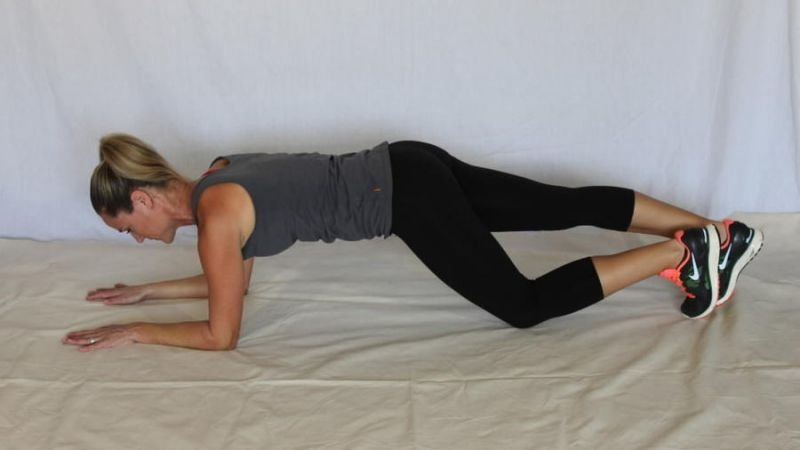Get into the plank position, on your forearms and do knee taps for 30 seconds. Keep your hips parallel to the ground, try not to move them and pull your belly up. Slightly touch the floor with your knees one by one. You should already starting to feel a burn in your abs even it’s only the first minute of the workout.
