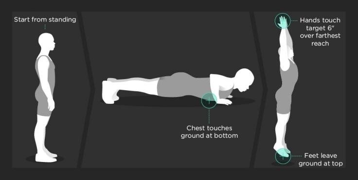 From standing, squat and plant hands on the ground, jump feet out to do a pushup, and then return to the standing for a jump.