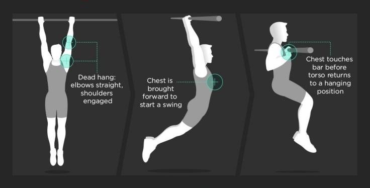 Hang from a bar with elbows straight and shoulders engaged. Using the momentum from your body, swing and drive your chest up to make contact with the bar. then return to a hanging position.