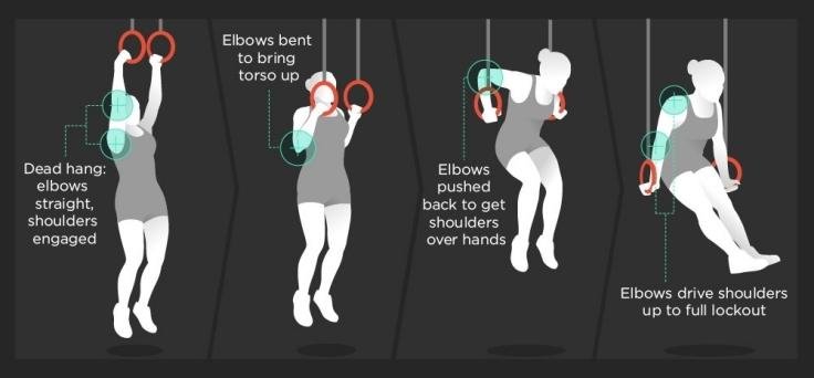 Tip: Drive your hips and torso up in a kip to ease the transition from under the rings (or bar) to on top.