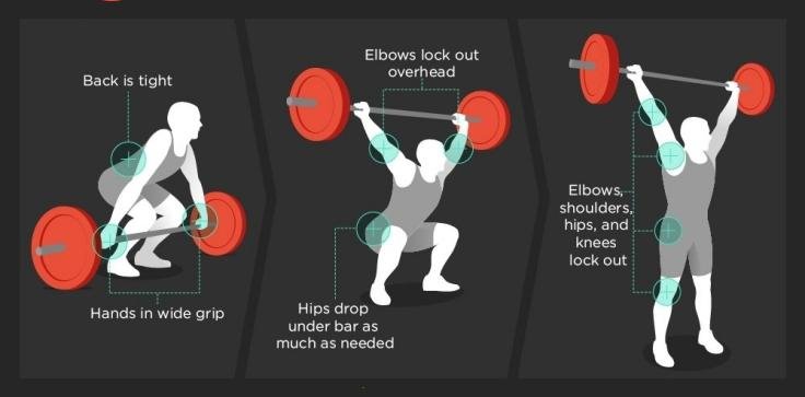 Take a barbell from the ground, with a wide grip and back straight, and catch it overhead in a single movement. You should be in a low squat position with elbows locked out overhead and hips below knees.