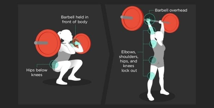 In a single movement, take a barbell from a squat and stand to put it overhead.