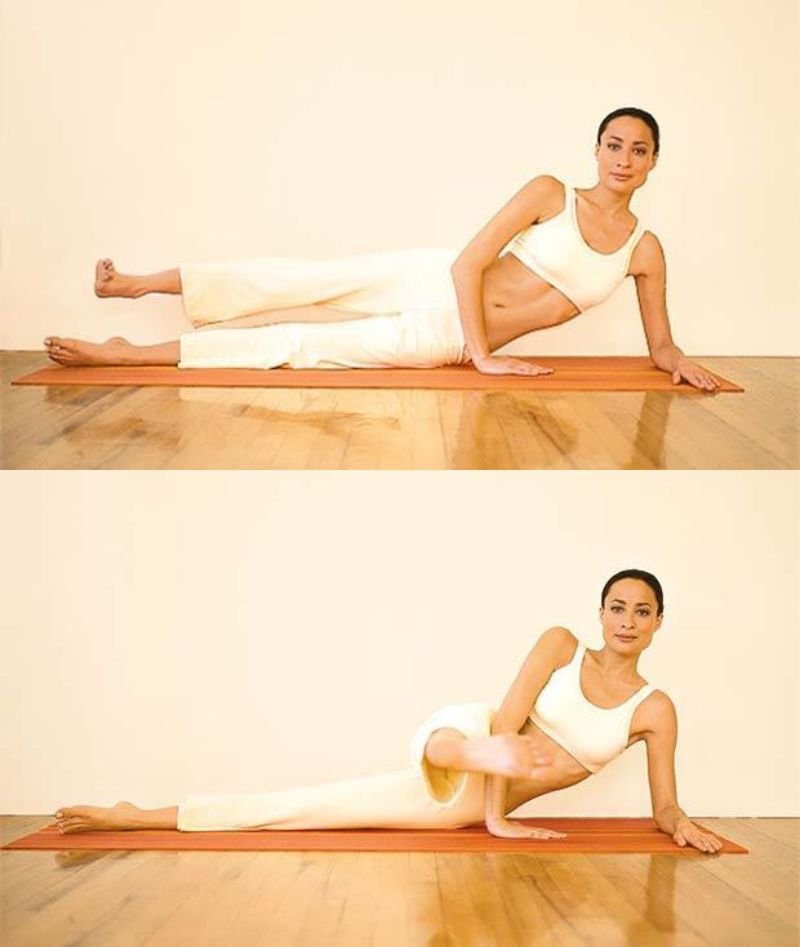 - Lower your left limb for a count of two. As you inhale, move the hip and dip your toes to the floor.