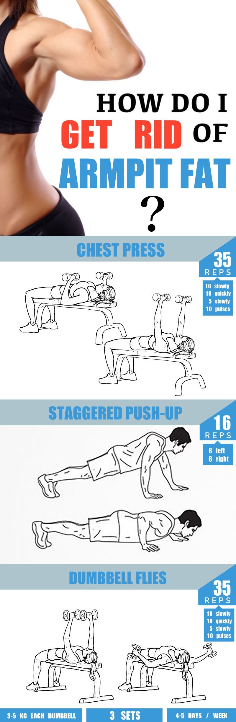 Take a one minute rest between sets and repeat this workout to get rid of armpit fat 2 or 3 times. Do this 2-3 times weekly combined with your total body cardio and strength training.