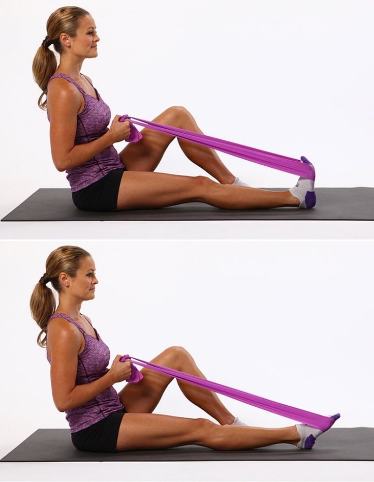 Wrap the band of the resistance band around your right leg’s toes and hold the ends tight with your hands. Lying down, push your toes out and squeeze the calf muscles. Repeat until you complete a set, then switch legs for another set.