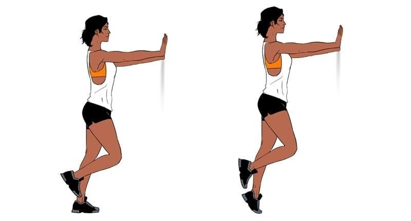 Get a Swiss ball and rest it against the wall, with your chest against it. Stand on the balls of your feet by lifting up. Lower down yourself slowly and repeat. You can do this with a single leg too, or you can grab some dumbbells in your hands.