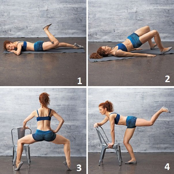 This is a wonderful gravity defying butt exercise that you can do both using your body weight, and using some sort of weight to help you get your sweat on! To do this, lie on your back, with your feet bent, and spread a bit wider than your shoulders, and make sure your hands are lying next to you on the floor, palms down.  Lift your butt off the floor until your body and your upper legs make a straight line. Hold for one second, then lower. Repeat this 20 times for the full effect.