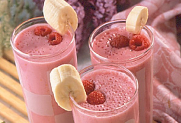 Combine 1/2 banana, 1/2 cup frozen raspberries, 1/2 cup fat-free Greek yogurt, and 8 ounces skim milk in a blender. Pulse until smooth. Eat with 1 slice whole wheat toast and 2 teaspoons peanut butter.