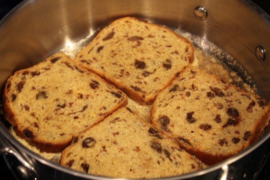 Whisk together 1 egg, 1 teaspoon honey, and 1/2 teaspoon cinnamon. Coat 2 slices whole wheat raisin bread with egg mixture. In a skillet misted with nonstick cooking spray, cook bread for 1 minute a side. Serve with 2 tablespoons each applesauce and fat-free ricotta and a dash cinnamon.