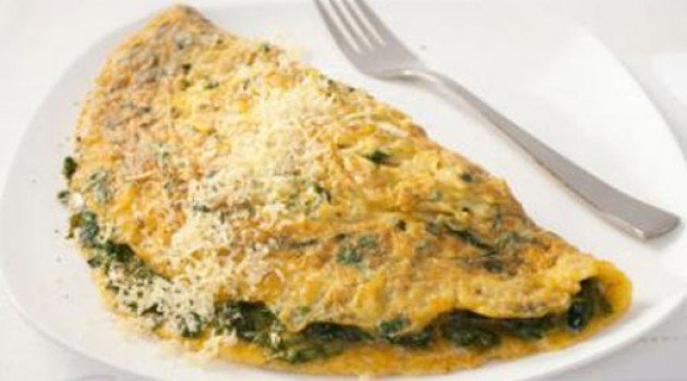 In a medium skillet coated with nonstick cooking spray, saute 1 cup chopped spinach and 1 tablespoon chopped scallion for 1 minute. Beat 2 eggs with a dash Tabasco; add to skillet. Cook until egg is cooked through, about 2 minutes. Flip and add 2 teaspoons grated Parmesan; cook 15 to 30 seconds. Serve with 1 slice toasted oat bread and 1/2 cup grapes.