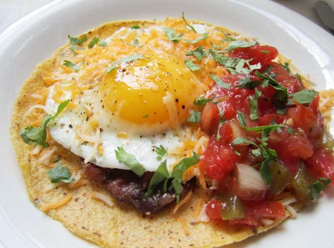 In a medium skillet coated with nonstick cooking spray, cook 2 eggs sunny-side up. Mix 1/2 cup black beans and 1/4 cup salsa. Top bean-and-salsa mixture and eggs with 2 tablespoons shredded reduced-fat cheddar.