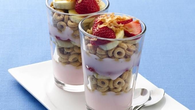 Peel and cut 1/2 pink grapefruit and 1/2 navel orange into segments. Combine with 1/2 kiwi, peeled and chopped, and 1/4 cup pineapple chunks. Place 1/2 cup nonfat Greek yogurt in a bowl. Spoon half the fruit mixture overyogurt, add 2 tablespoons high-fiber cereal. Add another 1/2 cup nonfat Greek yogurt, remaining fruit, and another 2 tablespoons high-fiber cereal. Top with 2 table­spoons shredded coconut.