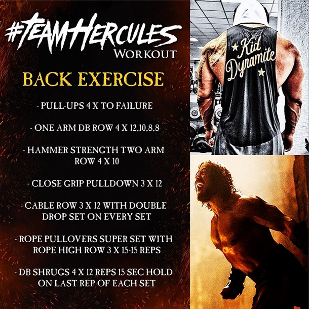 For his back Hercules workout, Dwayne Johnson did pull ups to failure four times, followed by one arm dumbbell row and hammer strength two arm row. Close grip pulldowns followed, and then cable rows. Then came a superset of rope pullovers and rope high row, and at the end some dumbbell shrugs. And by “some”, of course, I mean 4*12, at weights that would scare most.