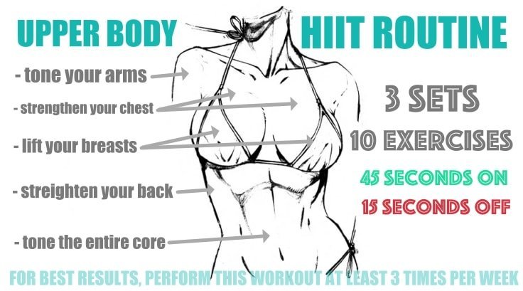 Remember to set the clock for each exercise as 45 seconds followed by a rest period of 15 seconds and then move onto the next one. Do 3 sets with 1-2 minutes rest in between them. For best results, perform this upper body HIIT routine at least 3 times per week.