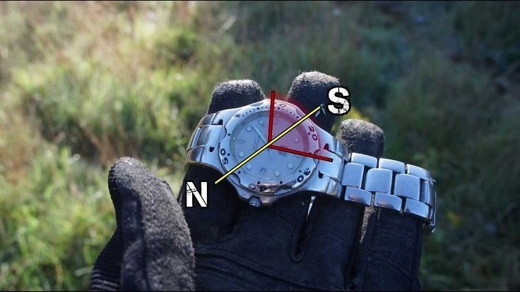 South will be located halfway between 12 and the hour hand, so North is located 180 degrees in the opposing direction. Use 1:00 rather than noon to change to daylight-saving time.