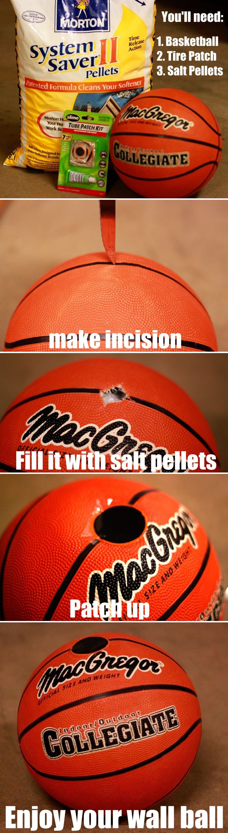 Fill the basketball with the salt pellets, then shake it around and do a few drops to get that last pound of salt pellets in there. A weight of 20 lbs would be optimal for your homemade wall ball.