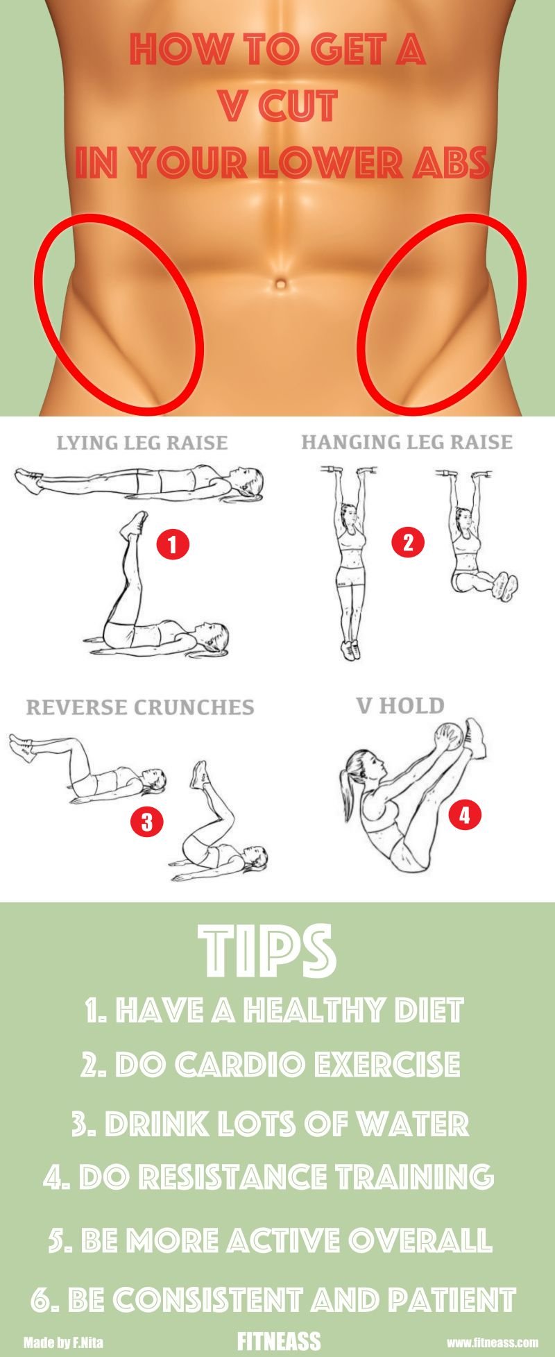 A varied lower ab workout routine can really help you strengthen your abs and defying that V cut. They will also help you reduce lower back pain and build a strong core. Here is a workout example you can follow to get your V cut abs: