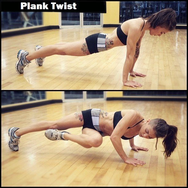 Start in a push up position. Your goal is to get down low and twist your knee to the opposite elbow. The lower you go, the more you’re gonna feel that contraction in your lower abdominals. Return to starting position and alternate legs.