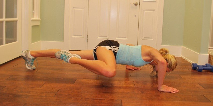 Start in a plank position with hands wider than shoulder-width apart. As you go down for the push up, you’re going to bring your right knee up to your right elbow and press up bringing the foot back. Repeat to the other side: left knee up to the left elbow.