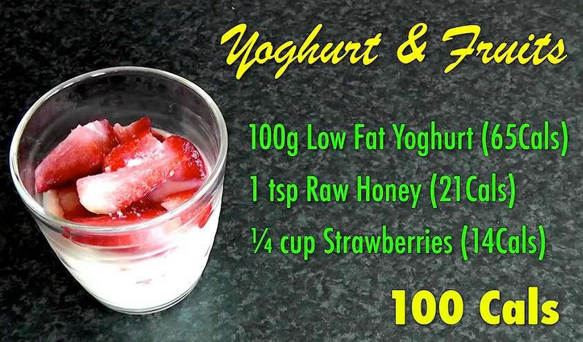 More healthy and light late night snacks include yogurt and fruits. Mix 100 grams of low fat yogurt with a teaspoon of raw honey and 1/4 cup of strawberries and you get a delicious snack with only 100 calories.