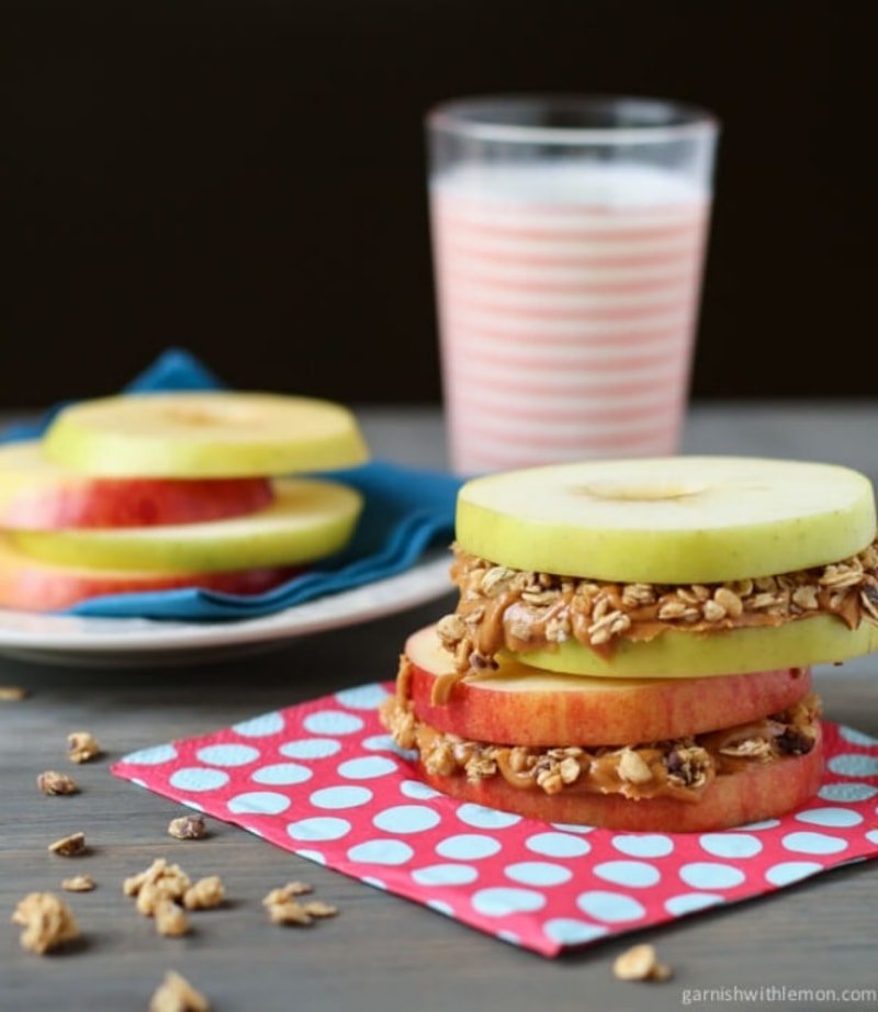 Check out the recipe for Apple Sandwiches With Almond Butter And Granola.