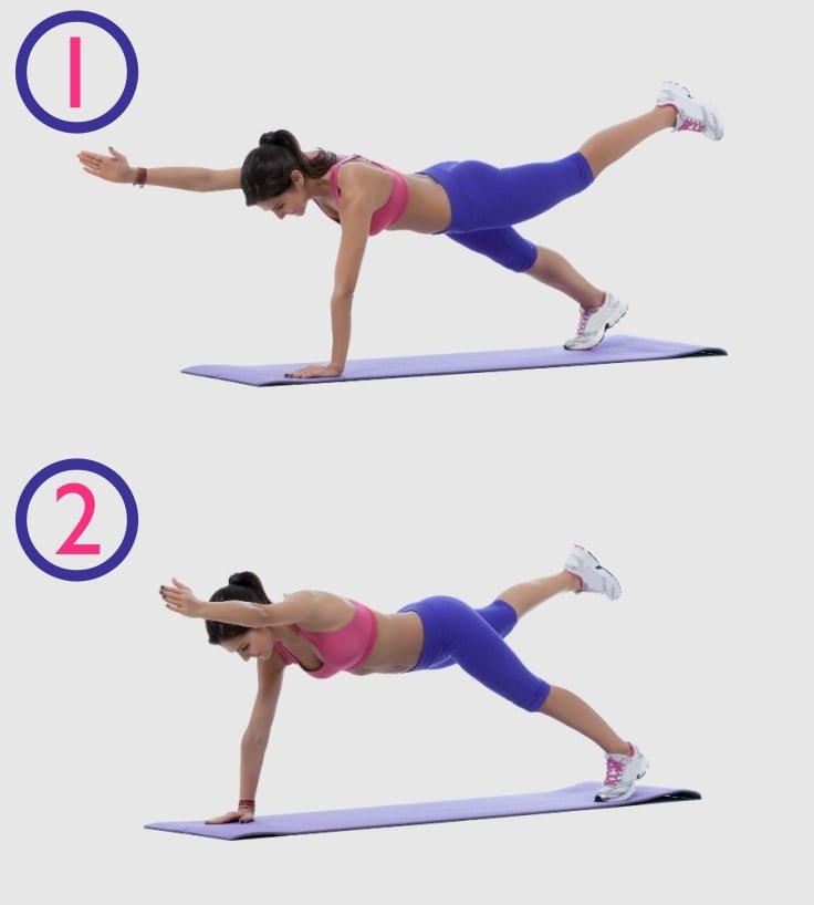 Hold into a diagonal plank position for 30 seconds, supporting your body with the right hand and left foot. Switch hands and feet and continue for another 30 seconds.