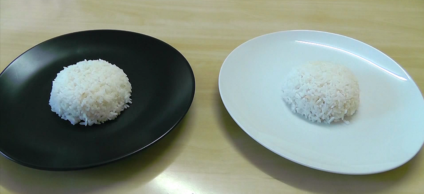 If you will eat from a plate that has no contrast to the color of the food tendency is you will eat more because your food looks less. If you will eat from a contrasting color from your plate, the tendency is you will eat less because the food looks more in comparison to the plate. Eating from a plate that has no contrasting color between the plate and the food means that you’ll end eating 22% more.