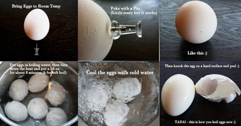 Before boiling it, bring the egg to the room temperature and poke it with a pin. I know this is a little scary, but trust me, the white and the yolk won’t come out through that tiny hole. Then proceed with the boiling process as explained above.