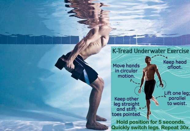 You don’t need any equipment for this simple pool exercise- it’s almost like kids play, but it gives you a good workout apart from all the giggles you’re bound to let out. Hold on to the side of the pool, belly-down, and flutter your legs as fast as you can. Yes, I know, it will be soooo tempting tosplash- but remember that if your legs are under the water the resistance is higher, so you’ll get a much better workout.