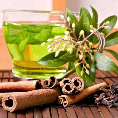Ingredients for 2 servings: a cup of green tea cooled, a cup of spinach juice, a teaspoon of ground cinnamon, one tablespoon of honey, a very ripe banana, ice cubes.