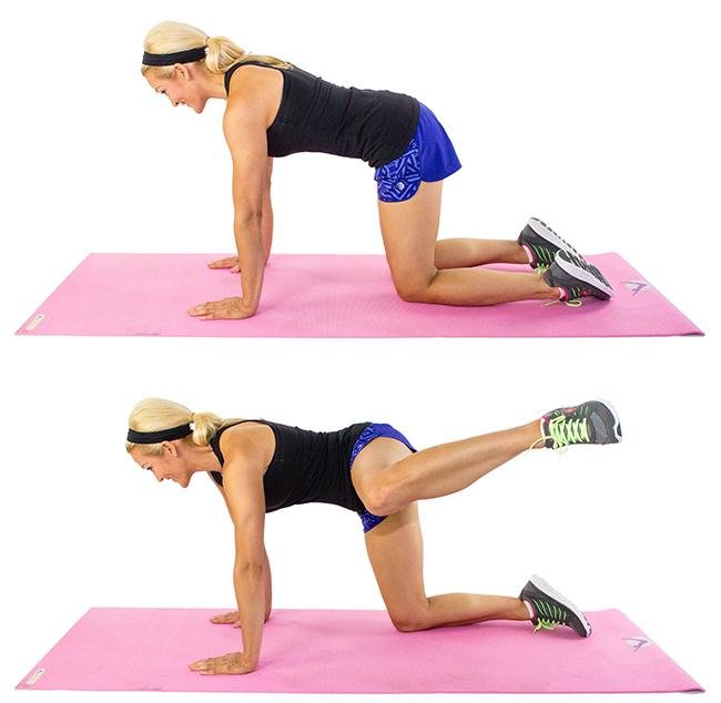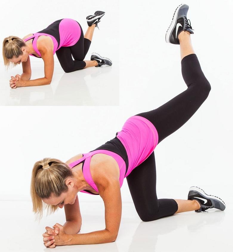 Get down on your forearms and lift one leg behind you. You need to strain your leg and lift it as high as you can. After 20 reps hold your leg up and pulse for about 10 seconds. Then switch legs and repeat the moves.