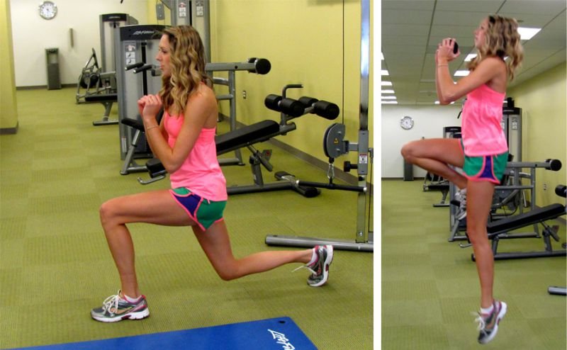 Lunge forward, bring your leg up and hop. Beginners can do this exercise without the hop, just lunge forward and bring your leg up.